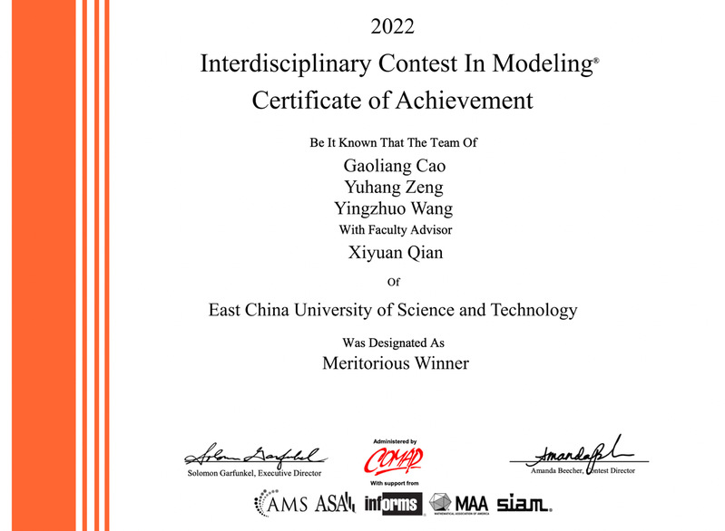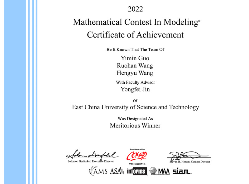 王恒煜团队获得一等奖(Meritorious Winner)。此外,我校还有6支参赛团队获得二等奖(Honorable Mention)。