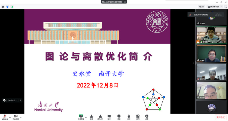 师生介绍了图论学科的发展历程、经典问题、代表性人物,以及图论与离散优化在人工智能、数据科学等新兴领域的应用,并就图论的研究方向和应用前景与韩国三级