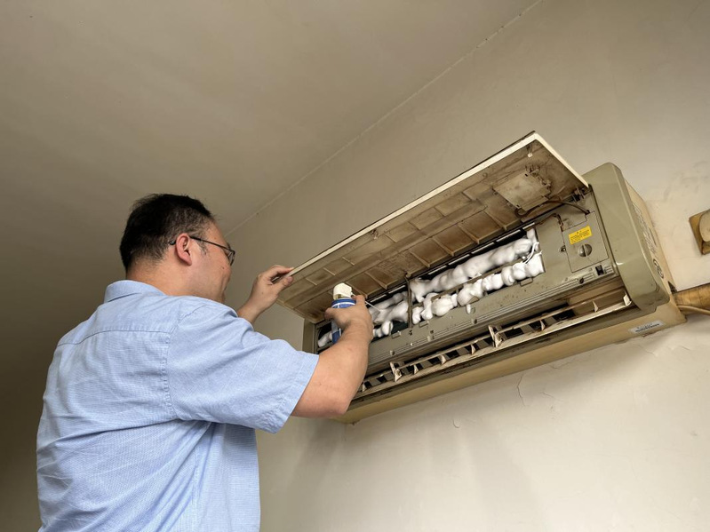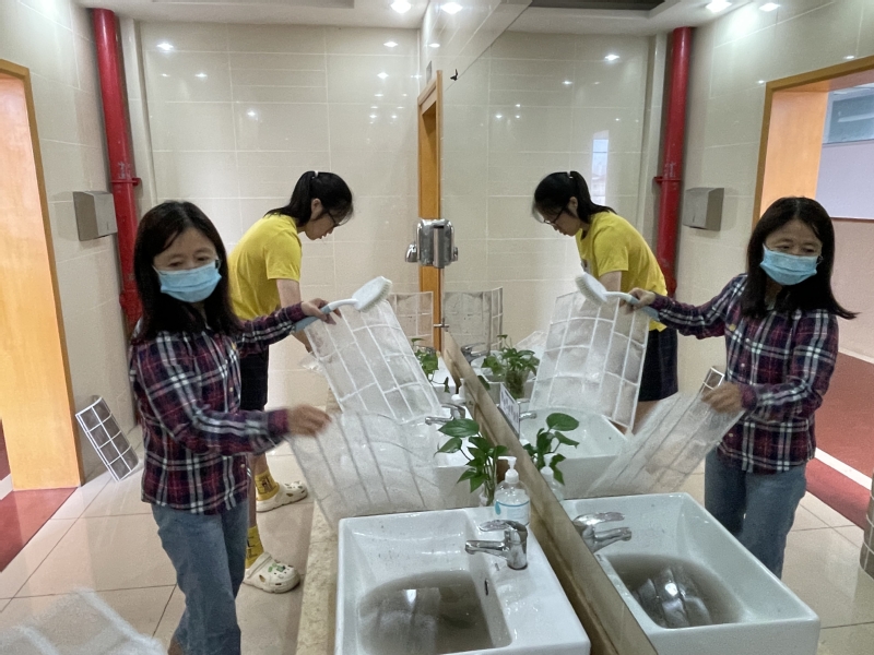 支部成员事先购买清洗空调需要的清洁剂、刷子、手套等工具,从八教5楼开始,逐个办公室敲门进行空调清洗。男同志主要负责将空调滤网拆卸下来,并将空调清洁剂喷到空调机身内部进行清洁。女同志主要负责将换下来的滤网刷洗干净。大家各司其职,一个楼层一个楼层逐一拆洗、清洁,并在一段时间后安装回去。