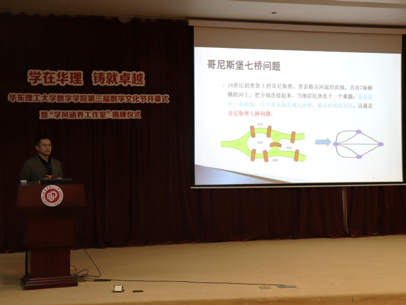 王光辉教授以其深厚的学术底蕴和丰富的教学经验,带领我们走进了图论这一离散数学的重要分支,探索了其在现代信息科学和技术领域的广泛应用。王教授首先从图论的历史渊源讲起,介绍了18世纪哥尼斯堡七桥问题,这是图论的起源之一。通过欧拉对这一问题的解答,图论与拓扑学的新分支得以诞生。接着从定义入手,为同学们阐释了有关顶点、边顶点的度等有关数学概念和分析图论问题的常用方法。